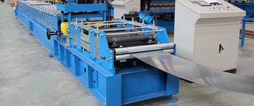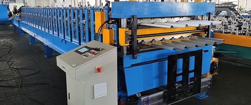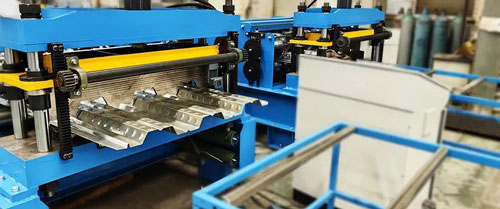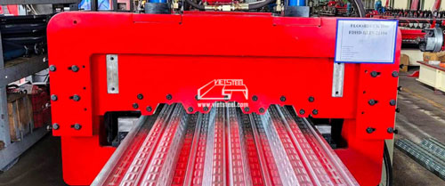 Deck sheet machine- Decking forming machine consists of de coiler and its base, coil sheet guiding equipment, roll forming system, post-cutting equipment, hydraulic station, PLC base controlling system, supporter table. The corrugated profile sheet produced by this machine has high strength with big rib, which adheres well to concrete.